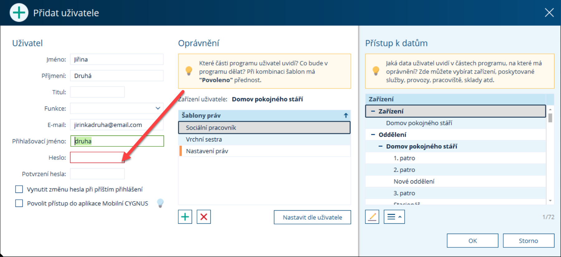 - Vynutit změnu hesla při příštím přihlášení (donutí uživatele při prvním přihlášení zadat své vlastní heslo)