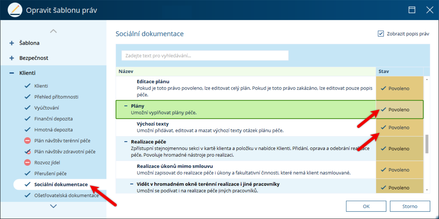 V šabloně otevřete sekci Klienti - Sociální dokumentace. Zde povolte právo Plány. Níže si ukážeme, jak ještě nastavit, ke kterým konkrétním plánům bude mít pracovník přístup.