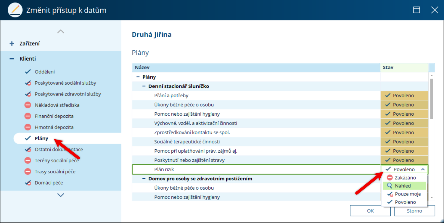 Každý pracovník musí mít přidělenou šablonu práv s povolenými Plány péče a v sekci Přístupu k datům povolené konkrétní plány, s kterými může pracovat.